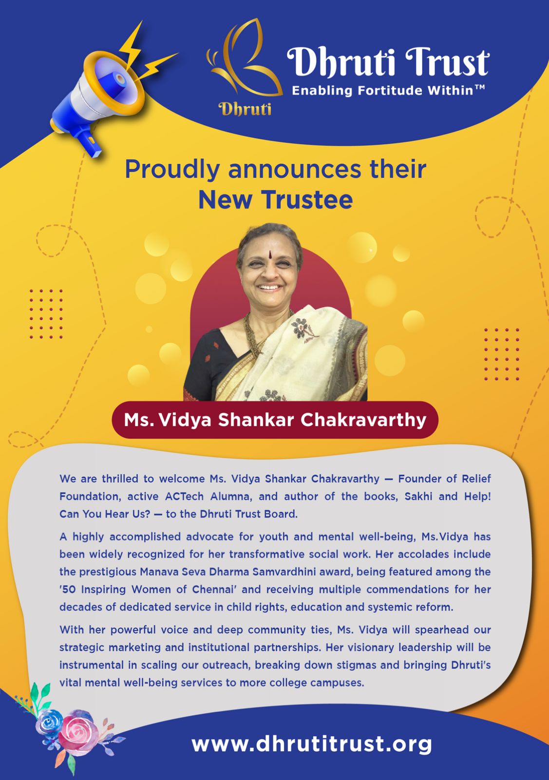 Dhruti Charitable Trust is a Chennai-based non-profit organization committed to transforming how mental health support is delivered to college students and young adults. Grounded in compassion, professionalism, and accessibility, we offer free, high-quality counseling services that are student-centered, stigma-free, and culturally sensitive.